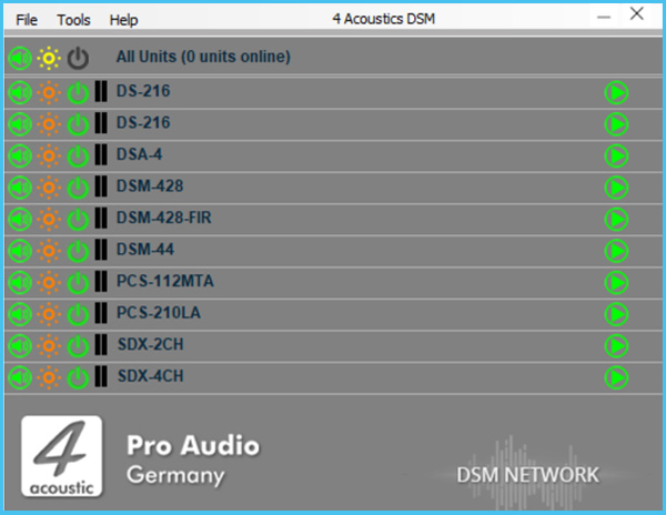 Eine Software für alle Geräte. Der DSM Network Client scannt das angeschlossene Netzwerk automatisch und listet die gefundenen DSM-Geräte auf. Dabei kann es sich um SDX-Endstufen, aktive Lautsprecher, aktive Line-Array-Lautsprecher oder unsere DSM-19"-Geräte handeln. Mit nur einem Klick öffnen Sie das Konfigurationsmenü des entsprechenden Geräts. Im Network Client können Sie auch Geräte gruppieren, wodurch Änderungen in der Konfiguration schnell und sicher in der gesamten Gruppe durchgeführt werden.