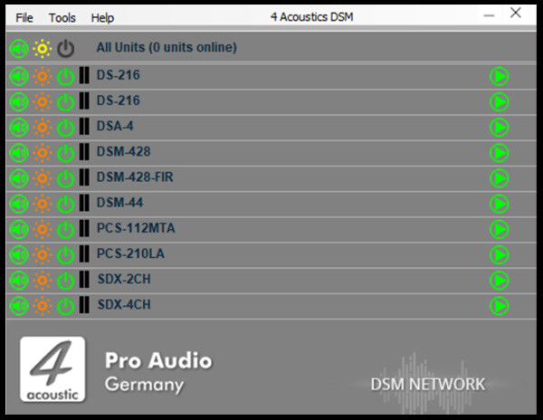 Eine Software für alle Geräte. Der DSM Network Client scannt das angeschlossene Netzwerk automatisch und listet die gefundenen DSM-Geräte auf. Dabei kann es sich um SDX-Endstufen, aktive Lautsprecher, aktive Line-Array-Lautsprecher oder unsere DSM-19"-Geräte handeln. Mit nur einem Klick öffnen Sie das Konfigurationsmenü des entsprechenden Geräts. Im Network Client können Sie auch Geräte gruppieren, wodurch Änderungen in der Konfiguration schnell und sicher in der gesamten Gruppe durchgeführt werden.